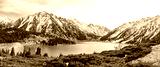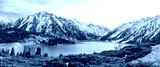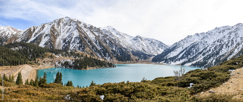 Beautiful mountain lake with ice and snow. Big Almaty lake in winter time. Kazakhstan.