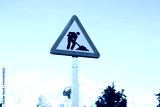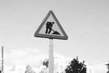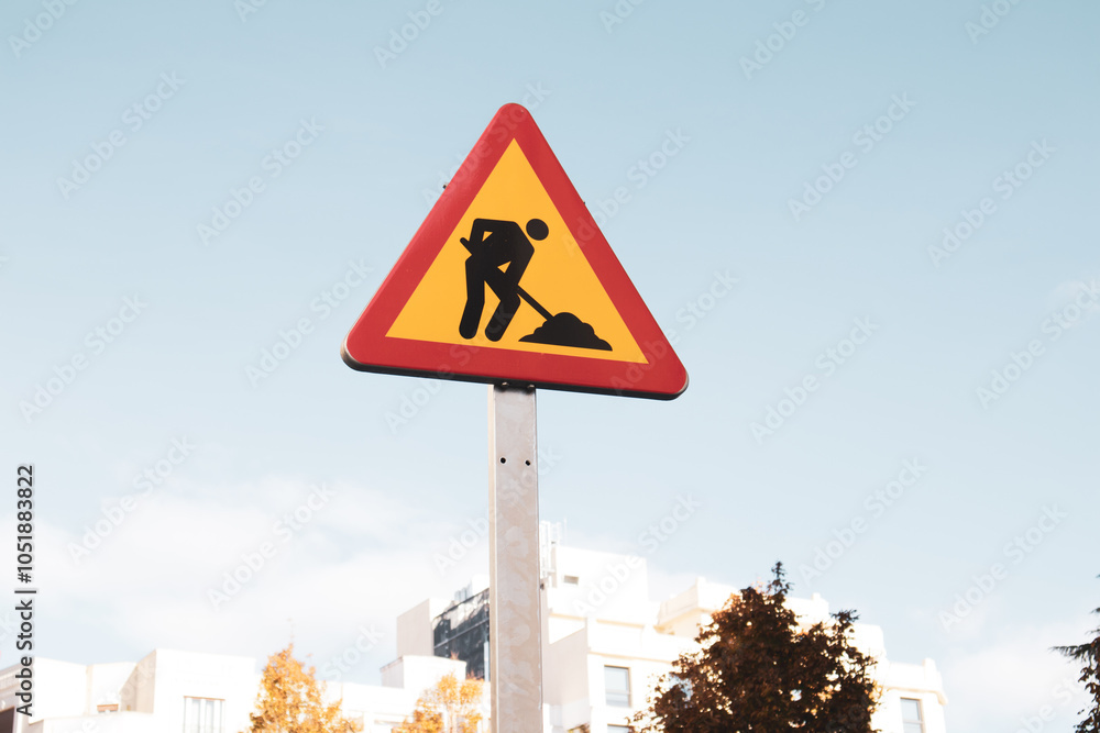 Roadworks yellow red triangular sign on street. Temporary construction icon