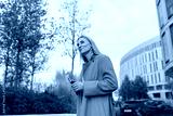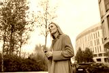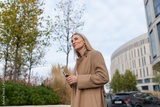 A businesswoman walks near a business center in the fall, holding her phone and looking up