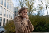 A businesswoman stands outside a business center, adjusting her coat in the cool fall weather