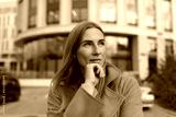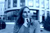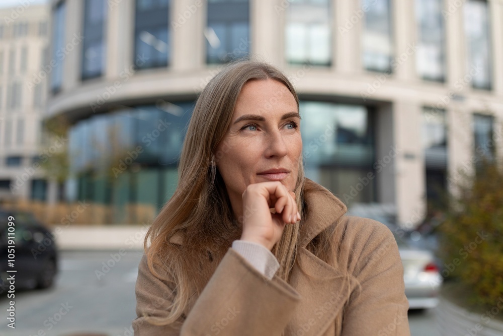 A businesswoman stands outside a modern business center, contemplating the day ahead