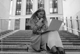 A business woman works on her laptop while seated on the steps of a modern office building during a sunny day