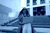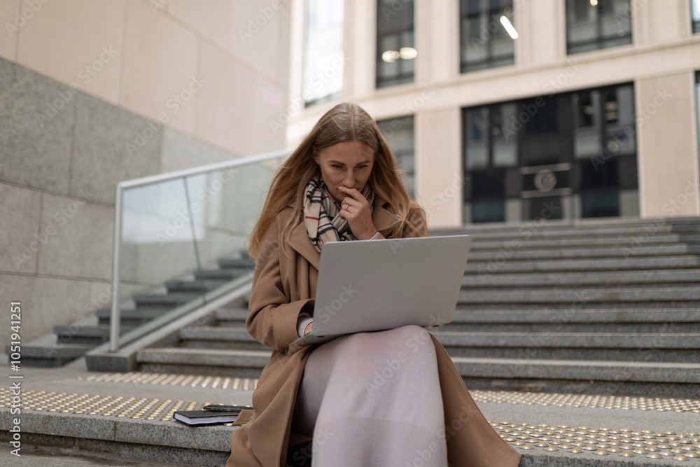 Business woman working intently on her laptop near a modern business center during a sunny day