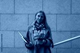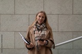 A businesswoman stands outside a business center, holding a laptop and a phone