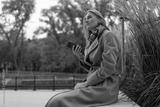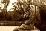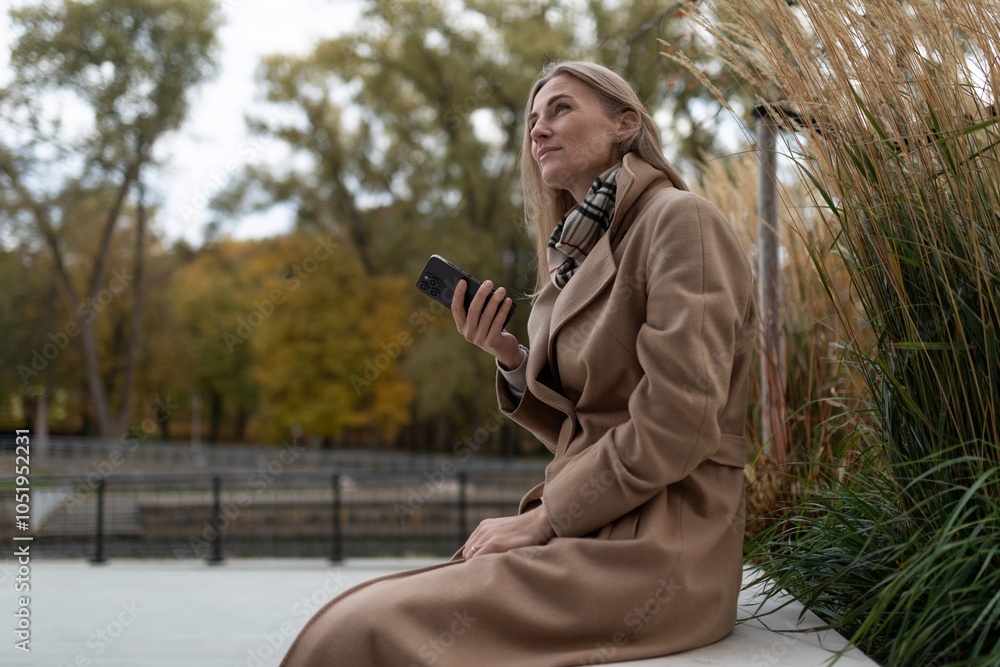 A businesswoman sits near a business center on a fall day, looking up while holding a phone