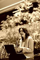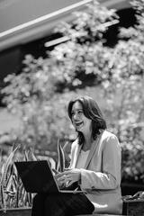 Contemporary workplace scene with a female CEO using a laptop in a green office setting