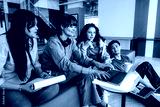 Casual group of young adults collaborating on a project with laptops in a contemporary office setting
