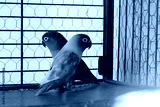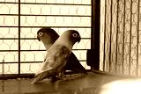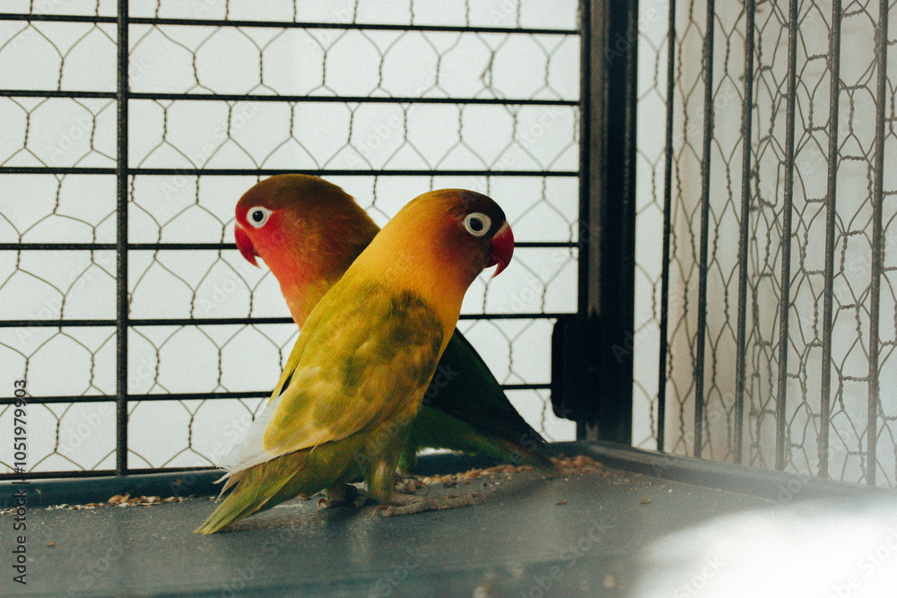 Lovebirds in a cage. Yellow and green birds in love. Nerosier Agapornis parrots.