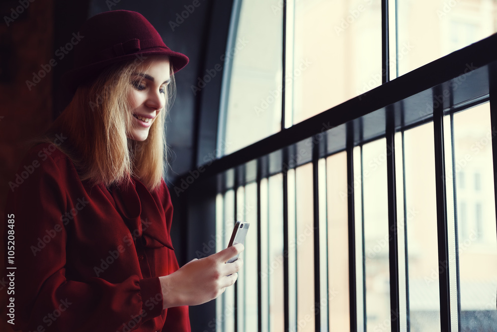 Portrait of young beautiful smiling woman looking at her smart phone. Model wearing stylish classic clothes. Close up. Toned