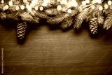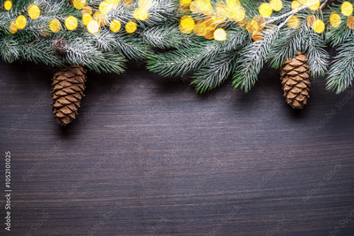 Blurred golden lights, snowy fir branch and cones as a frame on dark wooden background. Lay out.