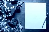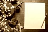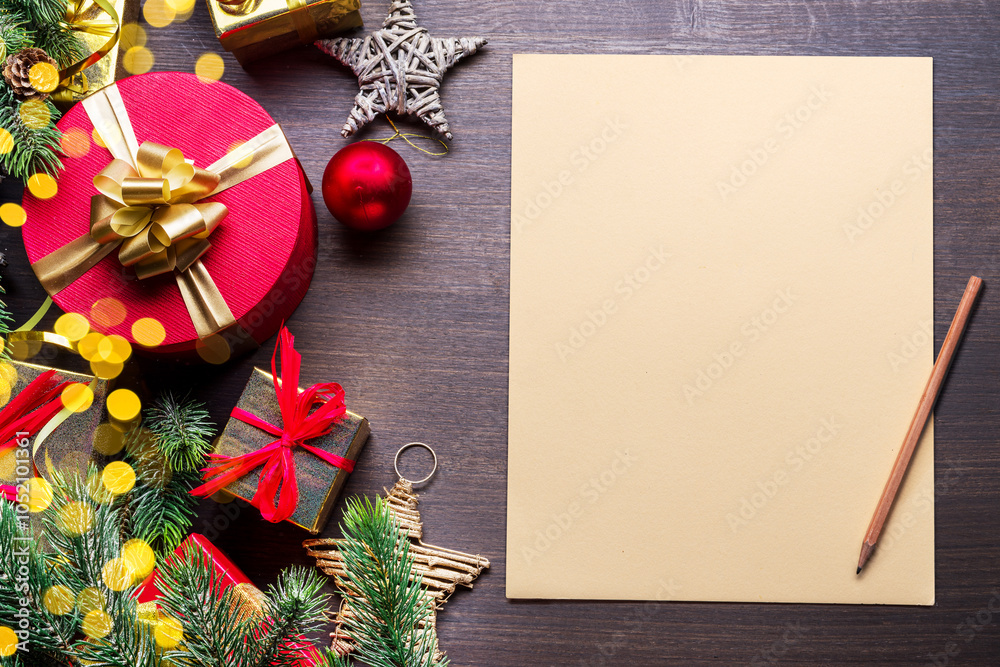 Christmas decoration, gift boxes and blank sheet of paper for writing letter to Santa on wooden table. Top view.
