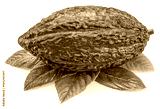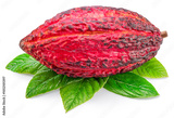 Red cocoa fruit or cocoa pod over green leaves isolated on white background. Clipping path.