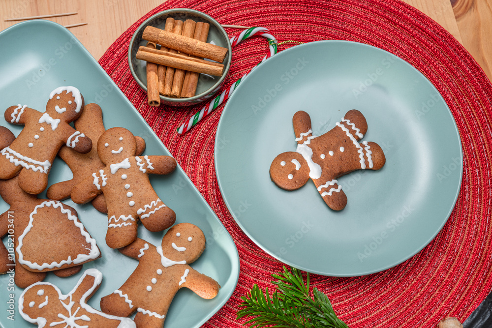 Gingerbread men, christmas cookies decorated with royal icing on blue plate, top view.