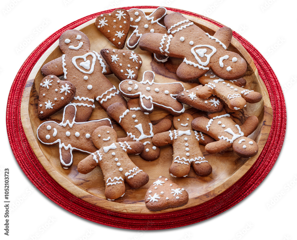 Wooden plate with gingerbread men on white background. File contains clipping path.