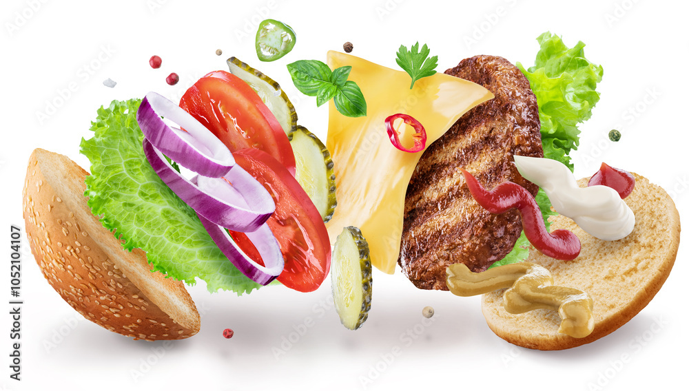 Ingredients of beef patty burger with vegetables and cheese levitating in air on white background. File contains clipping paths.