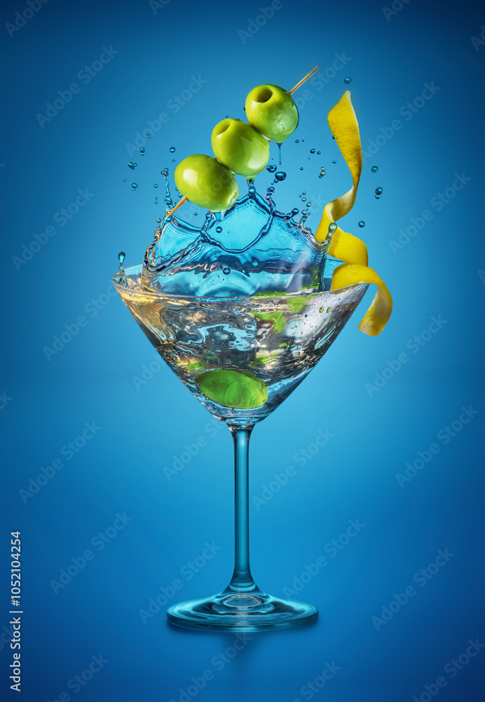 Martini glass with amazing splash from olive berries falling down in it. Blue background.