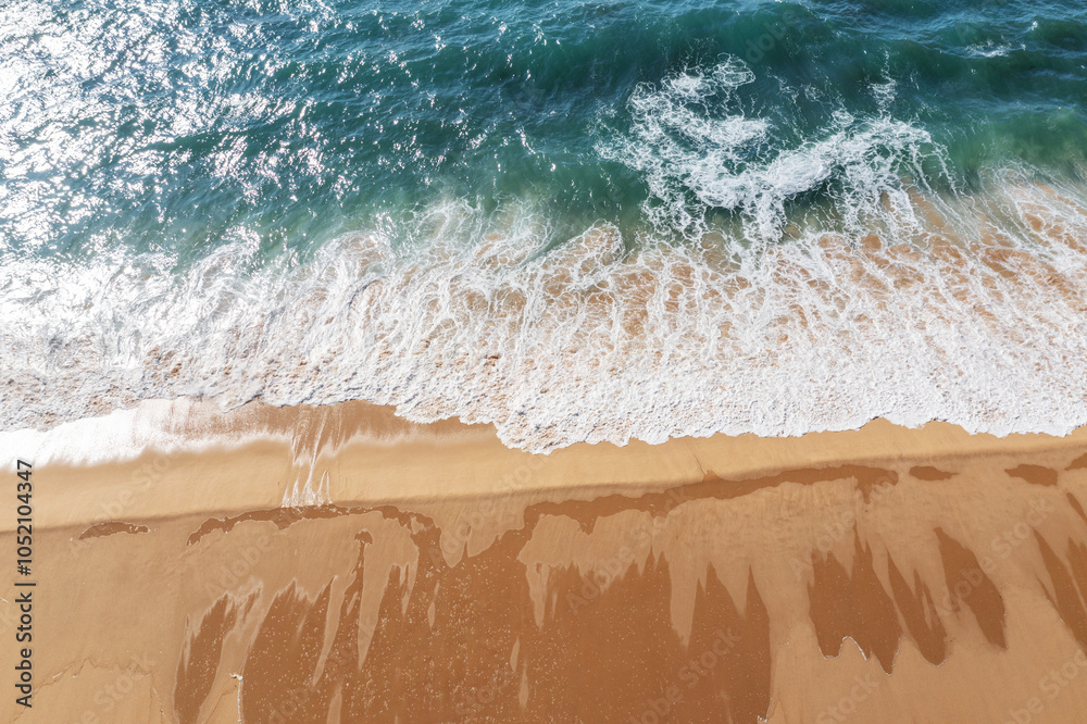 Azure ocean water and ocean foam covering beautiful long sandy beach, aerial drone view. Beautiful nature background.