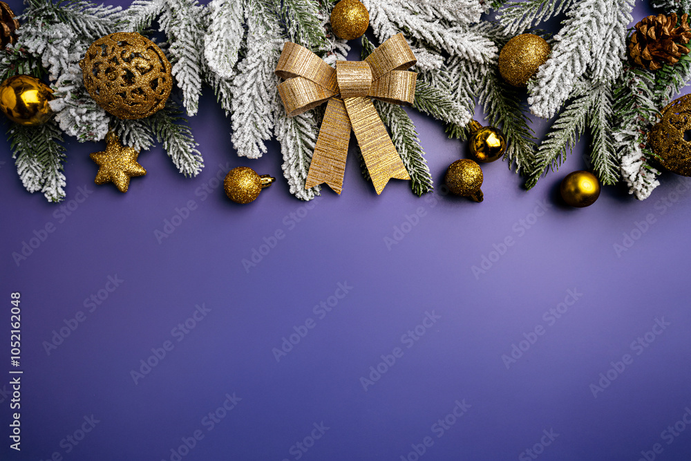 Christmas and New Year background with a festive scene with gold and red Christmas ornaments and fir tree branches on a purple background, symbolizing holiday spirit and elegance.