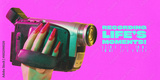 Poster. Contemporary art collage. Recording Life's Moments. hand with long red nails holds vintage camcorder against vibrant pink background. Concept of nostalgia, retro, pop art, 90s. Y2k style.