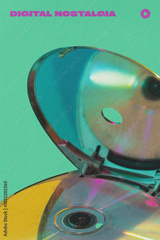 Poster. Contemporary art collage. Digital Nostalgia. Music time. Close-up of open CD case against vibrant teal background. Concept of nostalgia, retro, pop art, 90s. Y2k style.