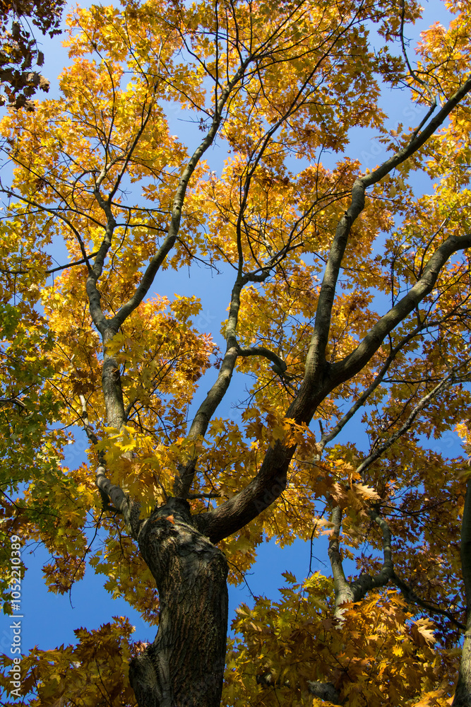 28.10.2024 Białystok Polska. Słoneczny jesienny dzień i złote liście na gałęziach drzewa.