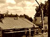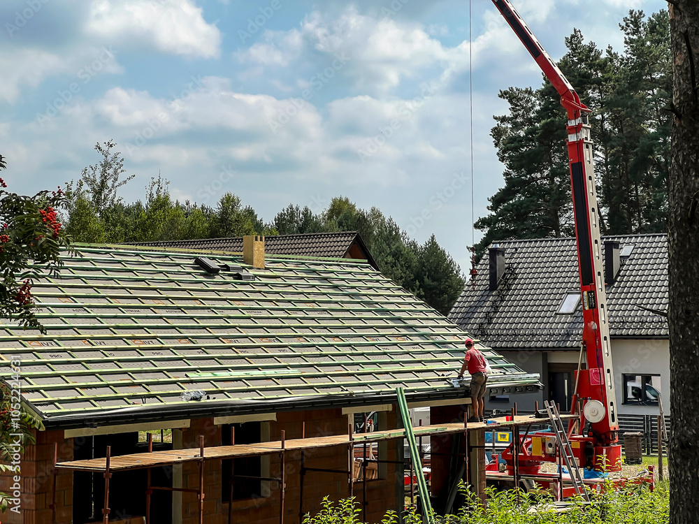 Construction of a single-family house. Roofing with ceramic roof tiles using a crane