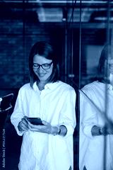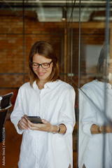 A young professional is focused on her smartphone in a chic office space, demonstrating productivity