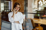 A cheerful woman in a modern office is having an important phone conversation, showcasing her professionalism