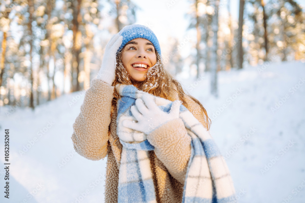 Happy woman laughing and enjoying a snowy winter day in the forest. Fashion style. Winter holidays.