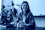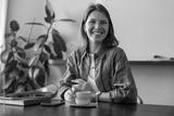A joyful woman sits at a table with coffee, surrounded by plants and books, exuding a warm atmosphere.