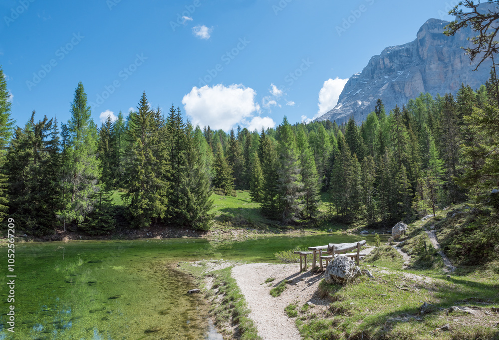 lake lech de la le at the foot of the heiligkreuzkofel mountain, hiking destination Badia, south-tyrol
