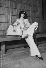 fashion shooting on location, stylish look, model girl with a bag.