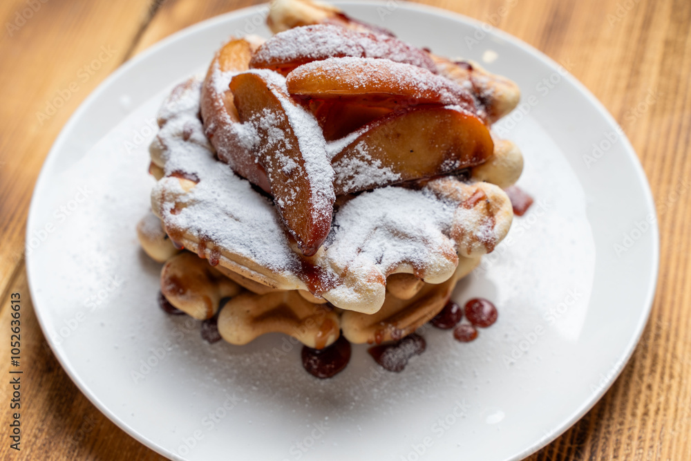 Belgian waffles with apples stewed in wine sauce sprinkled with powdered sugar on a white plate on a wooden background. Place for text