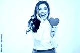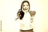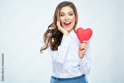Happy woman hold red heart. Long curly hair. Beautiful female m