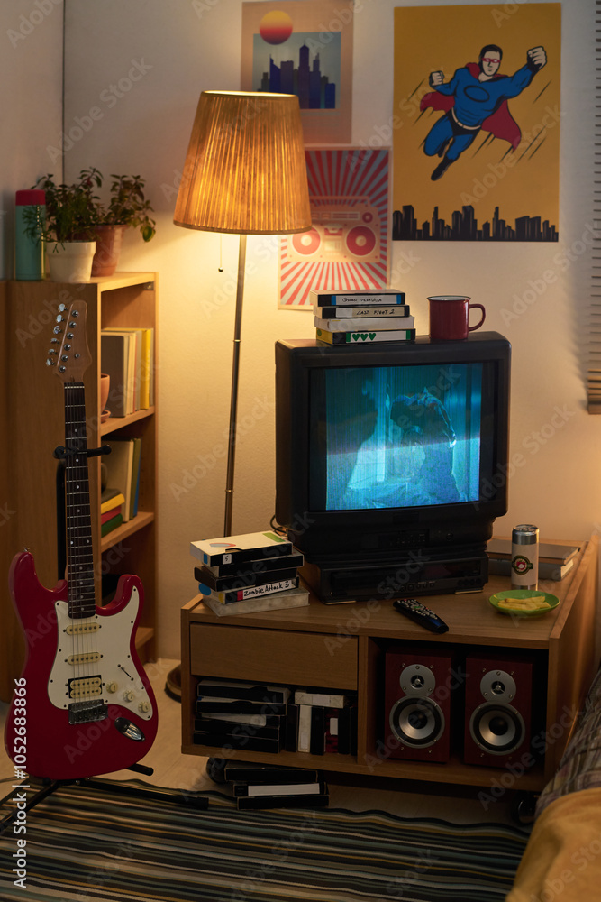 Cozy living room decorated with a mix of retro and modern art, featuring a vintage TV, guitar, wooden lamp, and bookshelf filled with books and plants
