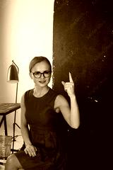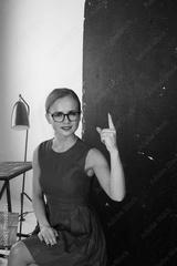 Young cute girl student teacher classroom desk chalk board, training, MBA, courses, trainings, education, blonde business, manager, office, thumbs up points, finger space glasses