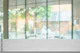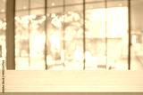 Wooden top table with abstract blur interior coffee shop or cafe for background. Restaurant interior banner, Hospital and clinic blurry. Blurred windows green on outdoor and view of light living room.