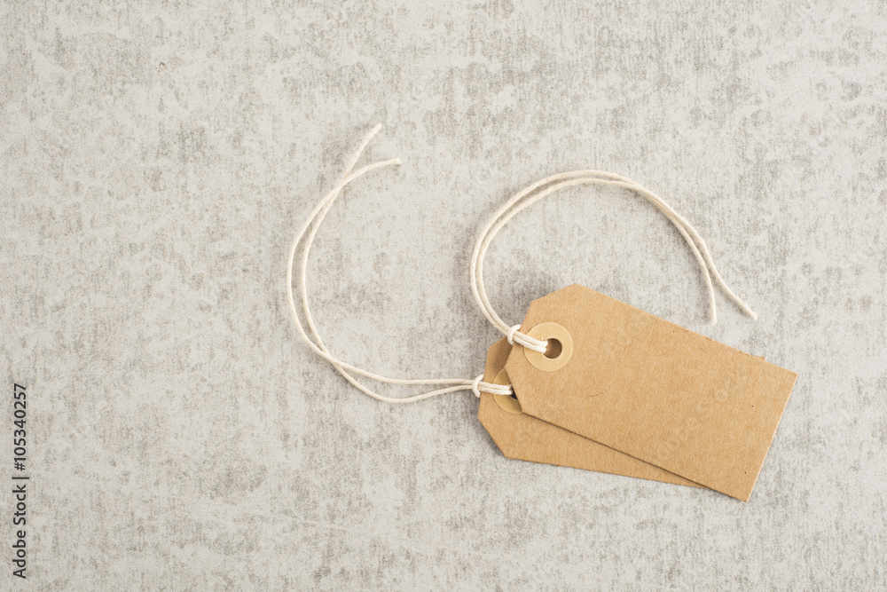 Two blank paper tags on stone background. Concept of sale, shipping or retail pricing.