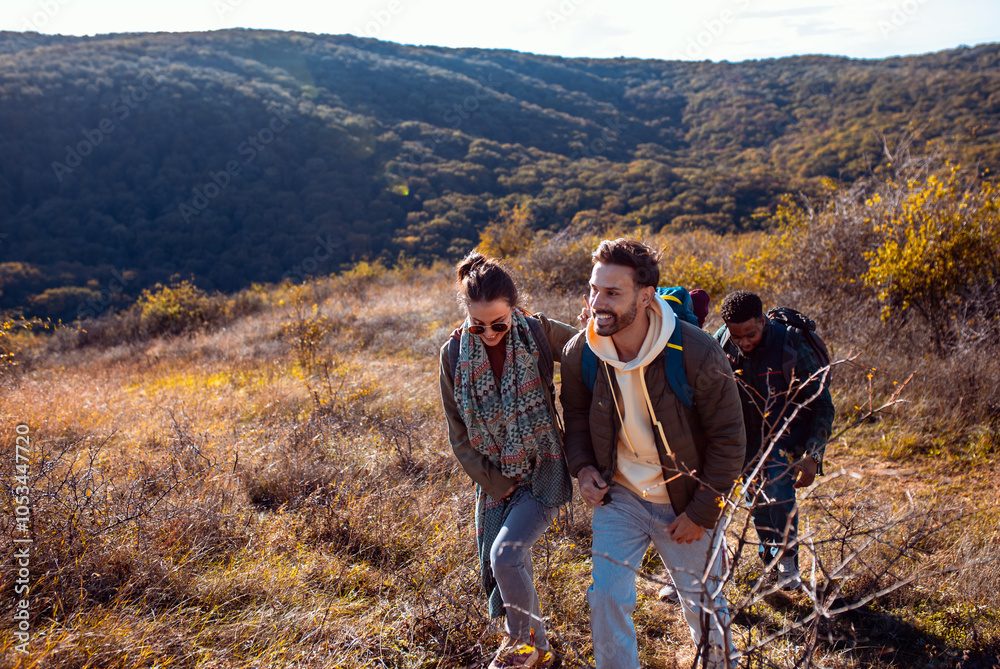 Smiling group of friends having fun while hiking together on hill at sunset.