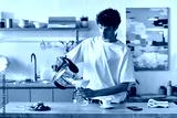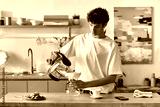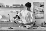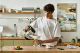 In a contemporary kitchen, a handsome young man pours coffee from a kettle into a glass, enjoying culinary moments.