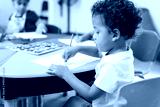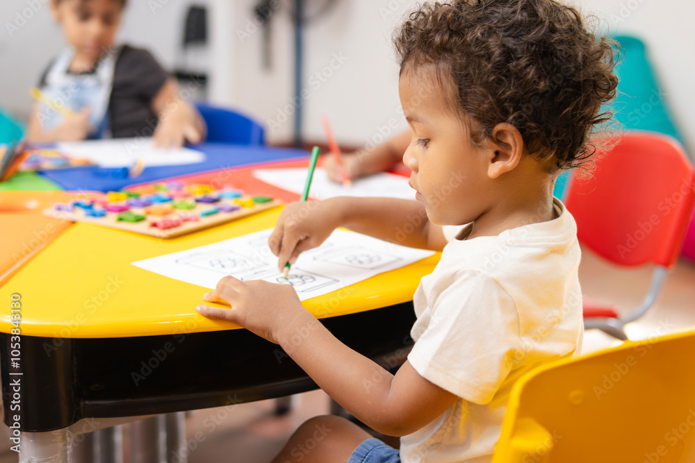 Close-up of a Latin boy in kindergarten coloring a recycling-themed assignment