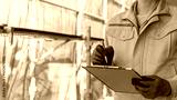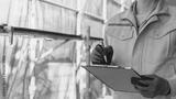 修繕工事の足場の点検をする作業服の男性