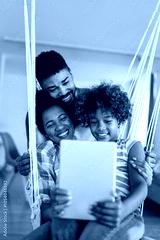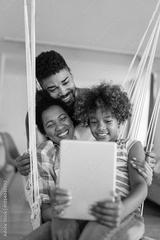 Happy african family having fun with device at home, using digital tablet looking at screen together