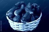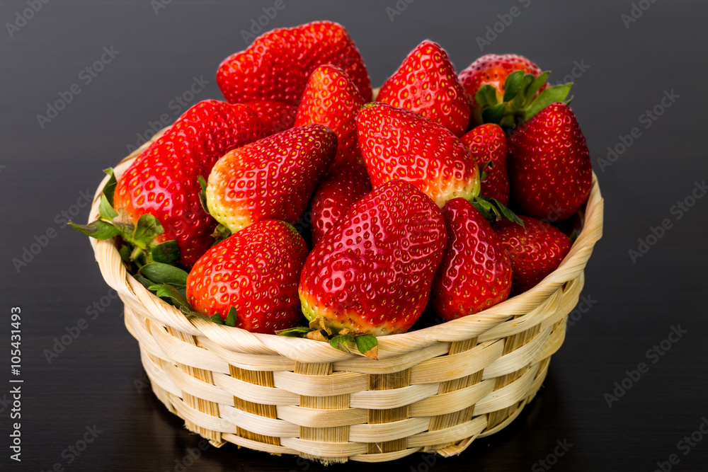 Fresh red strawberries in a wooden bowl on dark wooden backgroun