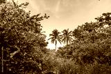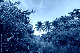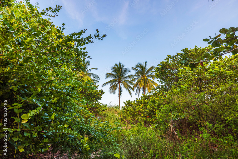 Dense tropical greenery with palm trees in the background under blue sky in Miami Beach.