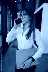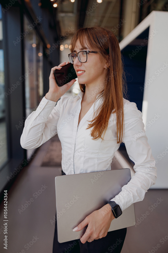 In a stylish, modern office, a confident woman engages in a phone conversation while working on her laptop effectively