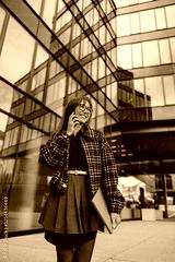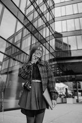 A stylish woman confidently talks on her phone while using her laptop, set against modern urban architecture