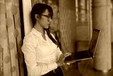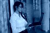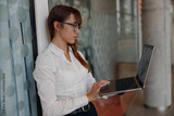 A businesswoman is focused on her laptop in a stylish and modern office, perfectly embodying todays work culture