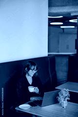 In a stylish cafe, a young woman happily enjoys a cup of coffee while diligently working on her laptop