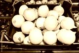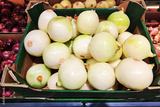 Box of fresh, raw white onions at a farmers market, ready for sale. Organic and nutritious vegetables displayed for healthy eating. Natural and unprocessed, ideal for balanced meals or vegetarian diet